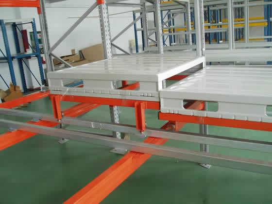 壓入式貨架也由托盤式(shì)貨(huò)架演變(biàn)而成,也叫後推式貨架或推入(rù)式貨架。采用軌道和托盤小車相結合的原理,軌道呈的坡度(dù)(3°左右),利用貨(huò)物(wù)的自重,托盤貨物被規定於單端存儲,貨物先進後出,適用於大批量少品種的貨物存儲,空間利用率很高,存取也較靈活方便。貨架總深(shēn)度(dù)不宜過深,一般在6個托盤深度以內,否則由於托盤小車相互(hù)嵌入的緣故而會使空間犧牲較大。單托貨物(wù)重量一般在1500kg以內,貨架高度一般(bān)在6m以下。 此類係統對貨架的製造精度要求較高,托盤小車(chē)與導軌間的配合尤為重要,如製造、安裝精度不高,極易導致貨架係統的運行不暢。此類貨架造價較高,非常適用於冷庫或存儲區域有限但急需增(zēng)加儲位(wèi)麵積的場合使用,在國內已有很多的應用。在國內隻有規模(mó)的貨架廠(chǎng)商生產此類貨架(jià)。 |