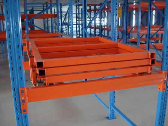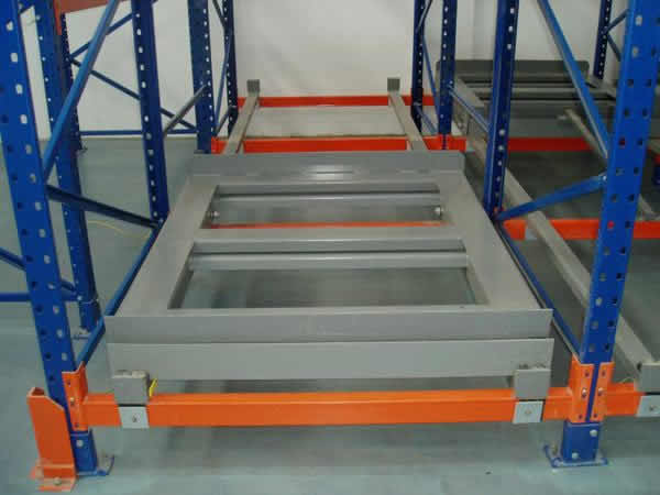 壓入式貨架也由托盤式貨架演(yǎn)變而成,也叫後推式貨架或推入式貨架。采用軌道和托盤小車(chē)相結合的原理,軌道呈的坡度(3°左右),利用貨物的自重,托盤貨物被規定於(yú)單端存儲,貨物先進後出(chū),適用於大批量少品種的貨物存儲,空間利用率(lǜ)很高,存取也較靈活方便。貨架總深度不宜過深,一般在6個托盤深(shēn)度以內(nèi),否則由於托盤小車(chē)相互嵌入的緣故而會使空間犧牲較大。單(dān)托貨(huò)物重量一般在1500kg以內,貨架高(gāo)度一般在6m以下。 此類係統對貨架的製造精度要求較高,托盤(pán)小車與導(dǎo)軌間的配合尤為(wéi)重要,如(rú)製造(zào)、安裝精度不高,極易導致貨架係統的運行不暢。此(cǐ)類貨架(jià)造價較高,非常適用於冷庫或存儲區域有限(xiàn)但急需增加儲位(wèi)麵積的場合使用,在國內已有很多的應用(yòng)。在國內隻有規模的(de)貨架廠(chǎng)商(shāng)生產此類貨架。