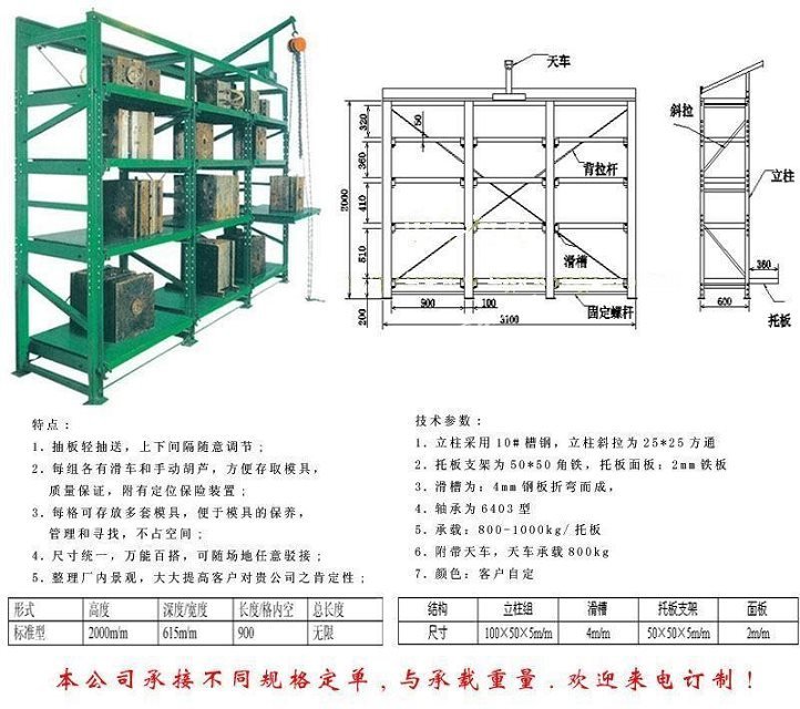 模具貨架是貨架的一種,簡稱:模具架。主(zhǔ)要存放各種模(mó)具物(wù)品(pǐn),根據層載能力(lì)要求分為輕型模具貨架和重(chóng)型模具貨架。貨架頂(dǐng)部可配置移動葫蘆車,以方便(biàn)模具的起吊。 模具貨架的特點: 1、組合裝配、主要由柱片、導(dǎo)向槽、抽屜(tì)層、拉杆、定位銷等,采用螺栓連接,結構穩定可靠,一般成排使用。 2、抽屜盤主要由滑軌、抽屜盤(pán)組成。抽屜盤(pán)由矩管加折彎件焊接而成的(de)框架和(hé)鋼板組成。 每條滑軌由兩(liǎng)個(gè)軸承前後上下固(gù)定,可以在導向槽內隨意(yì)滾動,阻力小(xiǎo),可(kě)以輕鬆拉出抽屜。 3、模(mó)具貨架的抽屜盤出於考慮,設計了定位銷和(hé)限位銷,以保證抽屜(tì)盤在抽出時保證。 4、輕型模(mó)具貨架層載在200到800kg/層。重型抽屜式貨架層載在:800到1500kg/層(céng)。 5、模(mó)具貨架占地少、層重大、分類詳細、操作簡單。 6、模(mó)具貨架還可以在貨位式貨架的橫梁上做抽屜盤,成本跟節(jiē)約,結構更穩固。